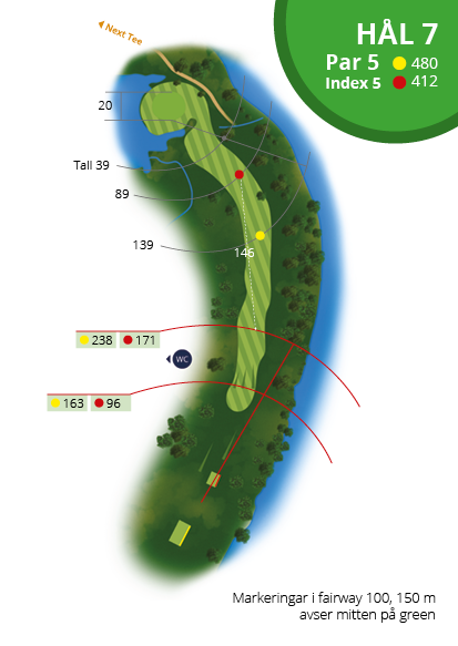 ca 180 m till Tallen i dogleg, ta det lite lugnt här.